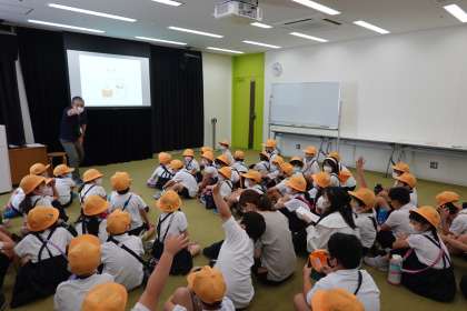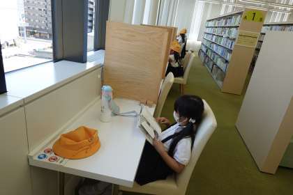城東図書館へ行ってきました。学校の図書室より広いスペースに、92,000冊もの本があり、どの本を読もうか迷いながら図書館の中を探検していました。