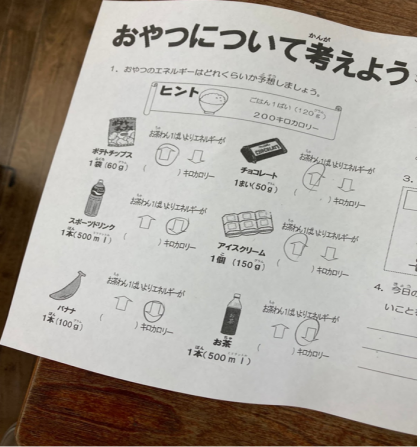 感想では、「これからは、キロカロリーを見て食べるようにしたい」「時間をきめて食べて、ダラダラ食べないようにする」等、ひとりひとりおやつの食べ方を考えてくれました。ご家庭でも、おやつの食べ方をお子様と一緒にお話しするきっかけになればと思います。