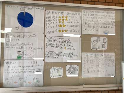 9月5日〜9日はパクパク週間です。玄関に、給食委員会による1学期のパクパク週間の結果の掲示物を貼っています。(写真参照)パクパク週間では、朝ごはん調べと給食調べをします。朝ごはんを食べて登校すると、授業に集中できたり、体を動かしやすかったり、とてもよいことがたくさんあります。朝ごはんを食べて、運動や勉強など頑張ってほしいと思います。早ね・早起き・朝ごはんで元気な体をつくりましょう。