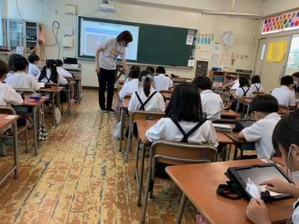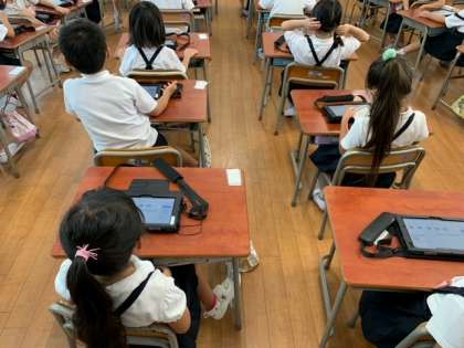 電源を入れる、IDやパスワードを入力する、アプリケーションを開くなど、基本的な操作を学習しました。初めて触れる学校のタブレットにみんな興味津々で、「先生、映ったよ!」「この画面、見たことある!」など嬉しそうな声が多く聞かれました。難しいところや分からないところは、ICT教育アシスタントの先生に教えていただきながらの45分でした。