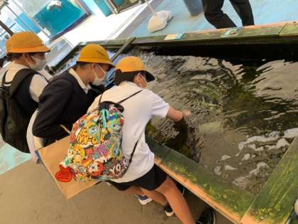 2階奥の水槽には、実際に触れ合える生き物(アカエイやマダコなど)たちがいます。