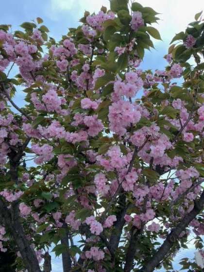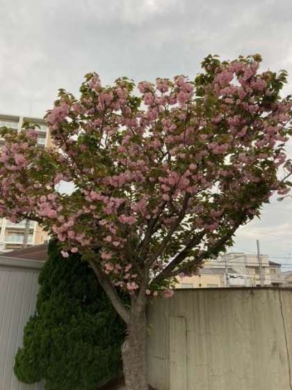 榎並小学校には(B校舎からC校舎への渡り廊下沿)八重桜が一本あって、今、満開の状態です!!