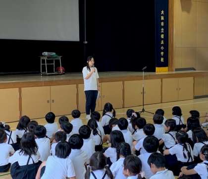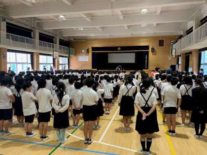 月に1回、全校児童が講堂に整列して、校長先生のお話や、その月の生活目標のお話を聞きます。