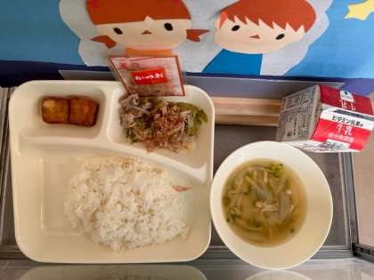 7月13日(木)の給食は、「ごはん、牛乳、ゴーヤチャンプルー、五目汁、あつあげのしょうがじょうゆかけ」でした。