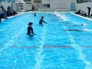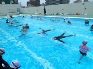 講師としてセントラルスポーツの方々に来ていいただき、水着の上から服を着てプールに入りました。