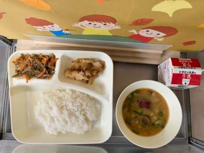 「ごはん、牛乳、体ポカポカ鶏肉のしょうが焼き、ほくほくさつまいもみそ汁、ピリッとひき肉きんぴらごぼう」でした。