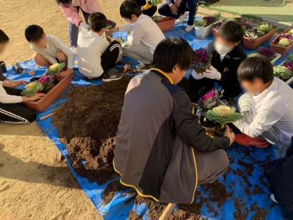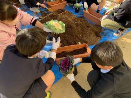 12月4日(月)の委員会活動の時間に、環境委員会がプランターに葉牡丹を植えました。地域の女性部の方々に葉牡丹の植え方を教わりながら、一つ一つ丁寧に植えていきました。