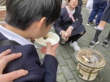 今日は昔の人たちがよく利用していた「七輪」を利用しておもちを焼きました。児童の感想では、普段おもちを焼く時は電子レンジで簡単に焼くことができるけど、七輪はとても大変だったと話してくれました。