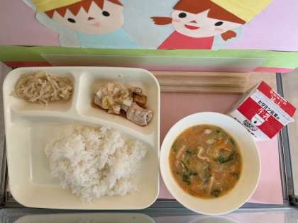 4月11日(木)の給食は、「ごはん、牛乳、焼きとり、みそ汁、もやしのゆずの香あえ」でした。