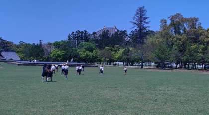 次に「春日野園地」に向かいました。カラッとした爽やかな青空の下、緑色の芝が鮮やかで、とてもすがすがしい景色でした。ご家庭で用意していただいたお弁当を食べて、その後は、思い思いに走り回ったり、周辺を散策したりするなどして過ごしました。少し予定より早めでしたが、奈良公園を後にして、帰路につきました。