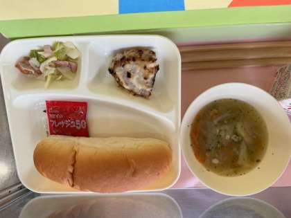 5月8日(水)の給食は、「コッペパン、牛乳、イチゴジャム、かつおのガーリックマリネ焼き、押麦のスープ、グリーンアスパラガスのソテー」でした。