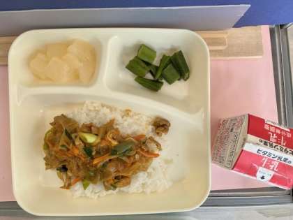 6月4日(火)の給食は、「ごはん、牛乳、和風カレー丼、オクラのかつお梅風味、和なし(カット缶)」でした。