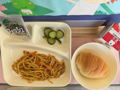 6.14(金)の給食は、「ミニコッペパン、牛乳、カレースパゲッティ、きゅうりのピクルス、ミニフィッシュ」でした。