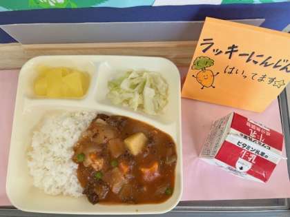 6月27(木)の給食は、「ハヤシライス、キャベツのゆずドレッシング、りんご(カット缶)」でした。