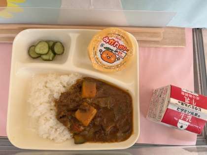 7月17日(水)の給食は、「夏野菜のカレーライス、きゅうりのサラダ、みかんゼリー、牛乳」でした。