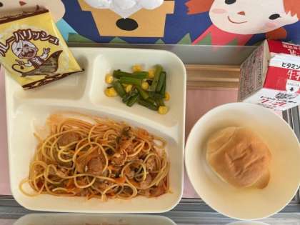 9月5日(木)の給食は、「ミニコッペパン、牛乳、イタリアンスパゲッティ、グリーンアスパラガスとコーンのサラダ、カレーフィッシュ」でした。