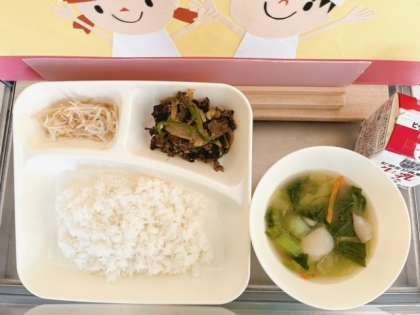 10月1日(火)の給食は、「ごはん、牛乳、プルコギ、トック、もやしのナムル」でした。
