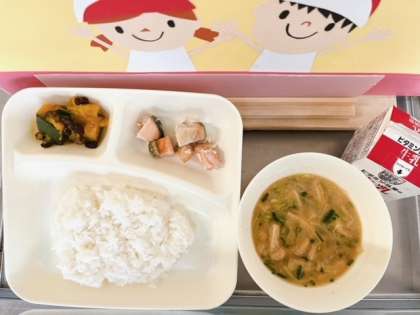 10月3日(木)の給食は、「ごはん、牛乳、さけの塩焼き、みそ汁、かぼちゃのいとこ煮」でした。
