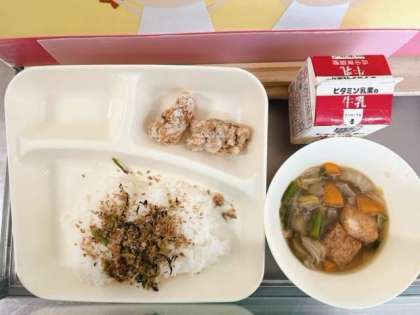 10月4日(金)の給食は、「ごはん、牛乳、鶏肉のたつたあげ、あつあげと野菜の煮もの、おかかなっ葉」でした。