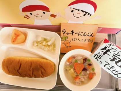10月9日(水)の給食は、「パンプキンパン、牛乳、鶏肉とさつまいものシチュー、はくさいのピクルス、かき(平核無柿)」でした。