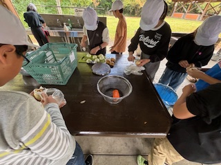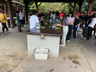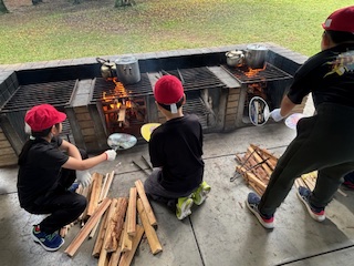 カレーライス作りが始まりました。かまど係、米係、野菜切る係と、役割分担に分かれて、仕事をしています。