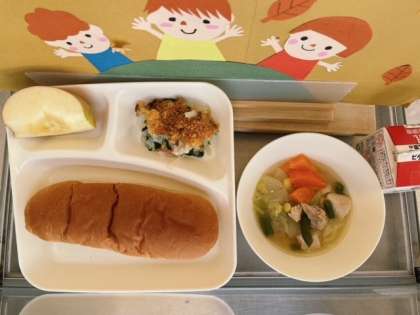 11月6日(水)の給食は、「黒糖パン、牛乳、ほうれんそうのグラタン、スープ煮、りんご」でした。