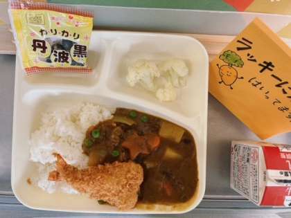 11月7日(木)の給食は、「えびフライカレーライス、牛乳、カリフラワーのピクルス、いり黒豆」でした。