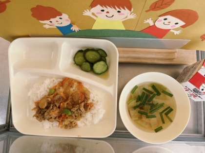 11月18日(月)の給食は、「ピリ辛丼、中華スープ、きゅうりの甘酢づけ」でした。
