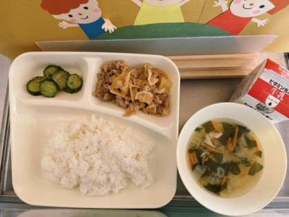 11月28日(木)の給食は、「ごはん、牛乳、豚肉のコチジャンいため、鶏肉とはるさめのスープ、きゅうりのナムル」でした。