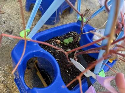 つるは丈夫で立派に伸びていたので支柱から取りだすのにかなり苦戦していましたが、ちぎれないように「これをこのつるの下に通したら取れそう!」「多分このつるは切らないと取れないな。」と沢山考えながら頑張っていました。