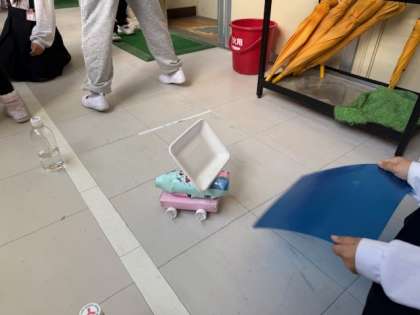 身の回りの物を使って作られたおもちゃを見て、初めは本当に動くのかな?遊べるのかな?と疑問に思っていた子どもたちでしたが、2年生に遊び方を教えてもらっているうちに「動いたー!!」とそのあとは必死になって遊んでいました。