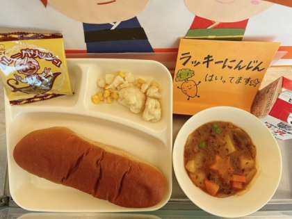 1月16日(木)の給食は、「黒糖パン、牛乳、ビーフシチュー、カリフラワーとコーンのサラダ、カレーフィッシュ」でした。