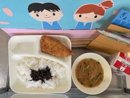 3月4日(火)の給食は、「ごはん、牛乳、いわしフライ、みそ汁、牛ひじきそぼろ」でした。