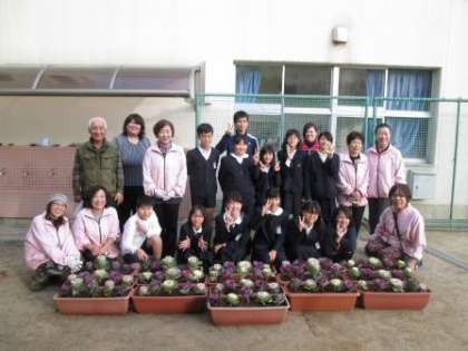 今学期最後の委員会活動に時間に、環境委員会が地域の女性部のみなさん、講師の西口さんと一緒に葉ボタンを植えました。