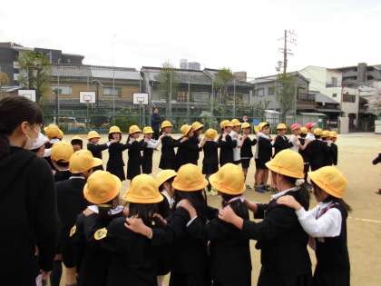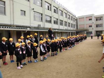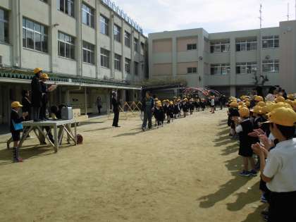 13日の児童朝会で1年生を迎える会を行いました。1年生はお祝いのメダルをかけてもらいました。その後じゃんけん列車をして全校で楽しく遊びました。