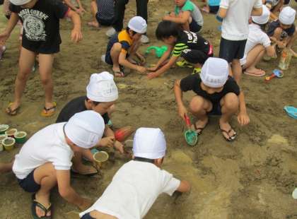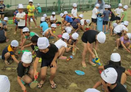 生活科の学習で、砂や土、水の特性をいかした遊び方の学習をしました。子どもたちは大はしゃぎで、山や川、土団子をつくるなど、工夫して遊びました。その後、プールにはいりました。