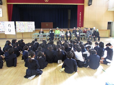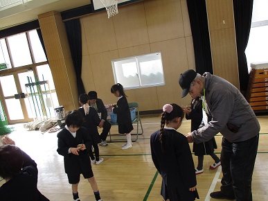 1月17日、老人会の方々に来ていただき、昔遊びをしました。名人にコツを教えてもらいながら、どの遊びも夢中になって取り組んでいました。