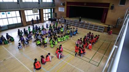 6年生と4年生で合同チームをつくり、協力して競技を行いました。一生懸命取り組む4年生とそれを優しく見守る6年生の姿が見られ、とても温かい雰囲気の中での活動となりました。