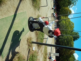 そのあとは、公園の遊具で遊びました。友達と高いところを目指してのぼったり、交代でブランコを押し合ったりと、仲良く活動することができました。たくさん体を動かしたあとは、お弁当を食べました。違うクラスの友達と食べたり、お弁当の中身を見せ合ったりと楽しい時間を過ごしていました。