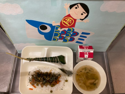 4月26日火曜日の給食は、「きんぴらちらし、牛乳、すまし汁、ちまき」のこどもの...