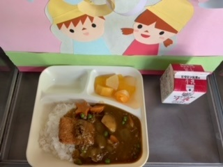 4月13日水曜日の給食は、「カツカレーライス、牛乳、フルーツゼリー」の入学お祝...