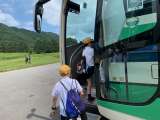 今、バスに乗って、宿舎を出発しました。 かねいちやの方に見送っていただき、楽しか...