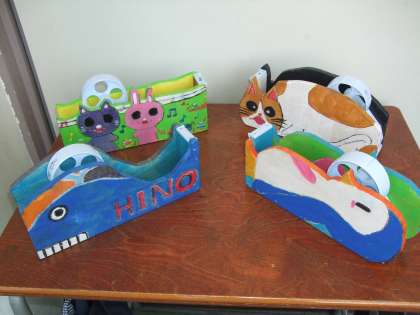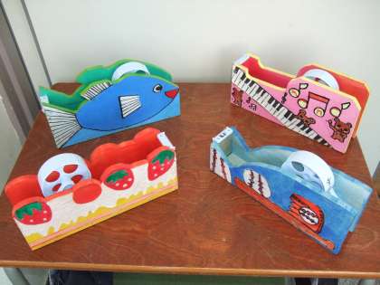 テープカッターが仕上がりました。ていねいに板を動かして複雑な切り込みが入っています。側面の彫りもきれいです。苦労して作ったテープカッターなので、使っていても楽しいだろうと思います。