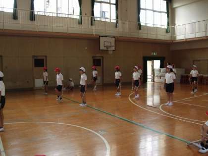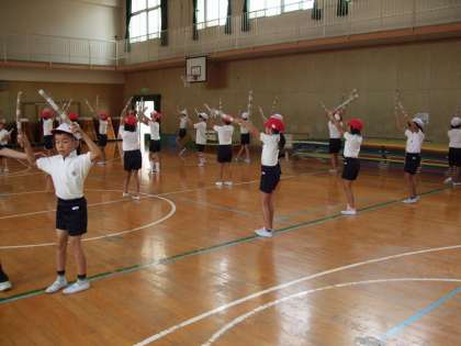 3年生は、講堂で新聞紙で作った棒を持ち、団体演技の練習をしていました。