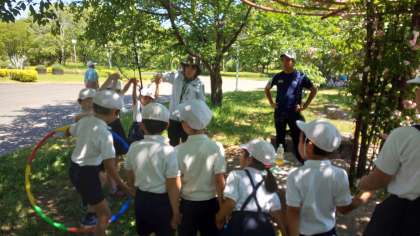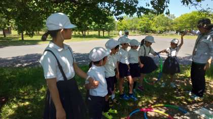昼食までは、縦割り班での活動です。公園まで、縦割り班で行き、オリエンテーリングを行いました。6か所のポイントでは、フラフープくぐりや名前リレー、早口ことばリレーなどのゲームもあり、グループで盛り上がっていました。高学年は、1年生をやさしく連れて行っていました。
