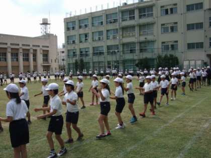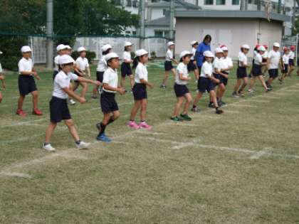 踊っています。17日の昼休みに運動場で隊形作りや踊りの練習をしました。
