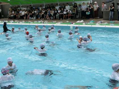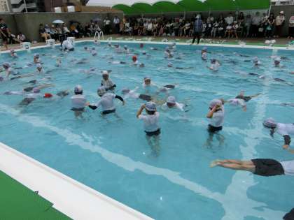 子どもたちは、体操服を着てプールに入り、いつもと違う様子に戸惑いながら、頑張っていました。服のままで水に入ったときは、絶対に脱がないよう指導を受けていました。参観ありがとうございました。