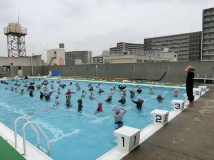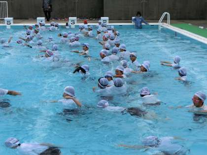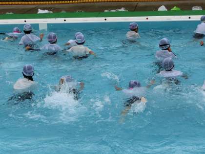 雨が心配されましたが、6年、3年、1年の子どもたちは、「重たい」「浮いたわ」など、いつもと勝手が違うことを感じながら、着衣泳を楽しんでいました。