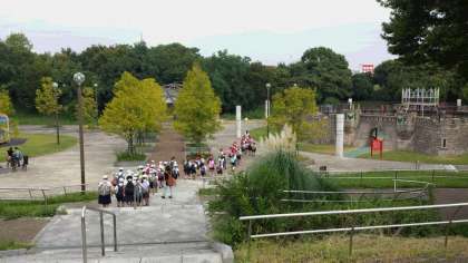 今回は欠席者が1人もおらず、全員参加で元気に学校を出発し、地下鉄とJRを乗り継いて四条畷駅で降り、歩いて公園へと向かいました。