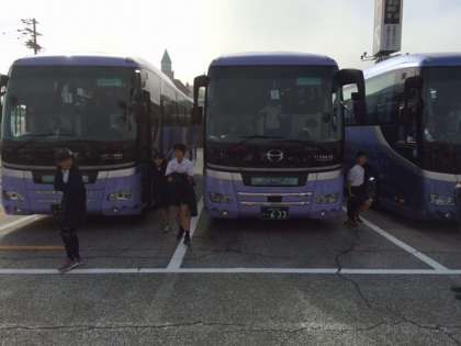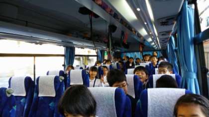 まず学校で出発式を行い、予定時刻にバスに乗り込みました。